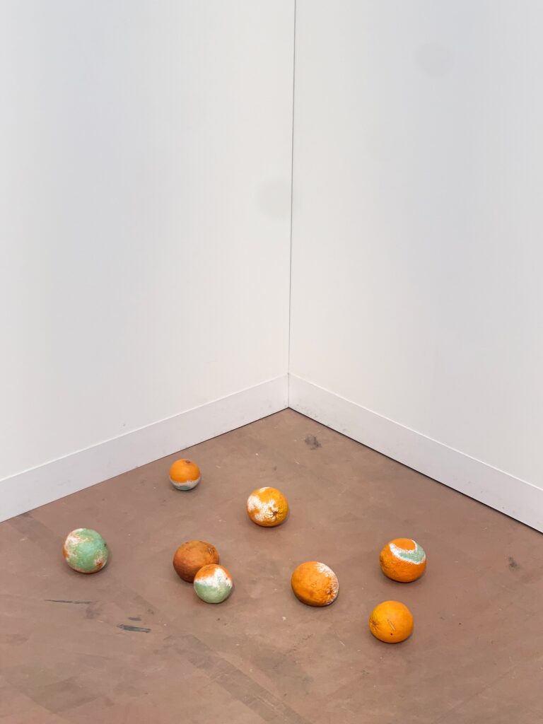 In einer Umgebung, die auf Schönheit, auf der Präsentation von Reichtum und dem Geld, das bitte möglichst schnell den Besitzer wechseln soll, ausgerichtet ist, sind die verfaulten Orangen, die da auf dem leberwurstfarbenen Boden des Grand Palais liegen, ein kurzer Moment der Irritation. Die Beton-Orangen faulen jedoch nicht. Sie sind angemalt und somit wieder sammler*innenfreundlich.